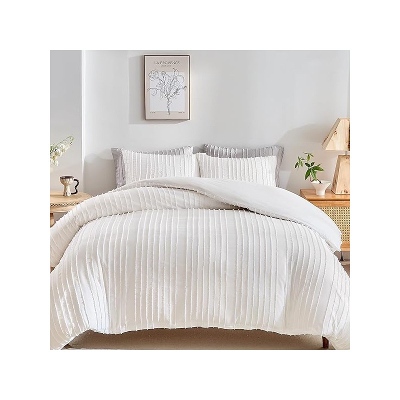 WARMDERN White Boho Duvet Cover Set King Size, Striped Textured Duvet Cover Tufted Bedding Set, 3 Pcs Ultra Soft Washed Microfiber Duvet Cover with Zipper Closure (King, White)