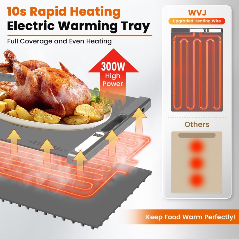 - [300W& 10S Rapid Full-Surface Heating]--WVJ advanced electric warming tray equipped with optimized heating wires that covers the entire surface, and fast heating up at 10s. The extra large 20.5"x13.4" heating area accommodates multiple dishes simultaneously, evenly distributing heat across ceramic/glass/stainless steel tableware - perfect for family dinners and buffet parties.
