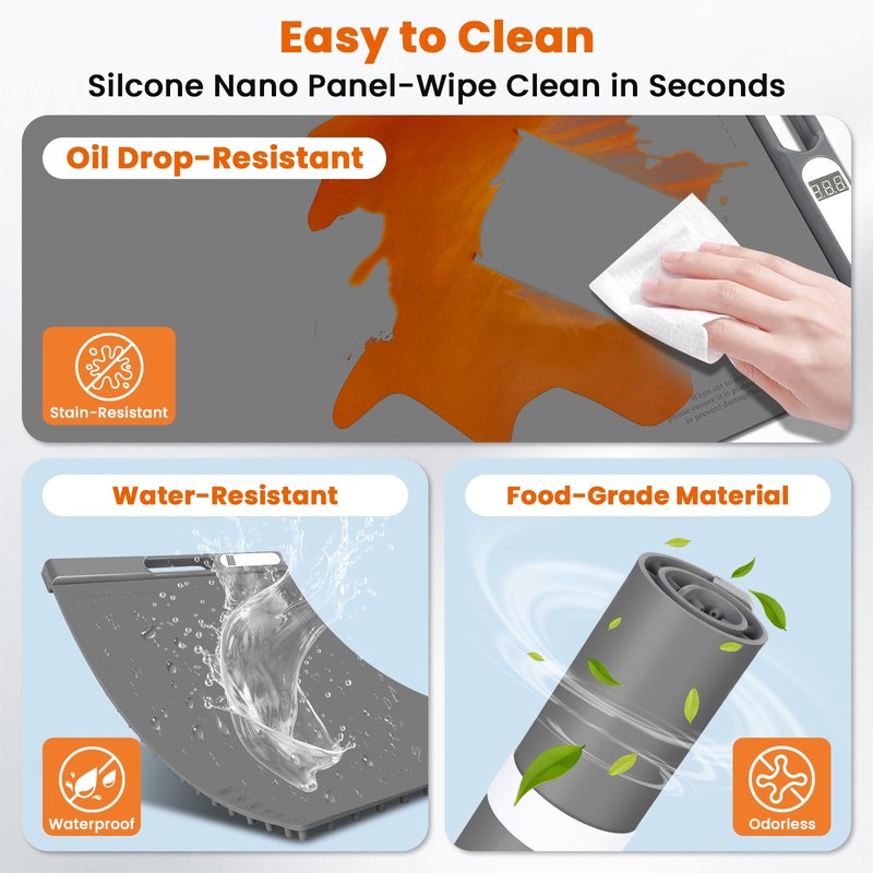 - [Effortless Cleaning and Storage]--Crafted from high-quality, flexible silicone nano material, our warming mat for food is odorless, stain-resistant, and easy to clean. Its 5mm thickness offers durability, while the nano-coated surface wipes clean effortlessly, making post-meal cleanup a breeze. Plus, it rolls to a 5"diameter tube tightly for compact storage, 80% space-saving.