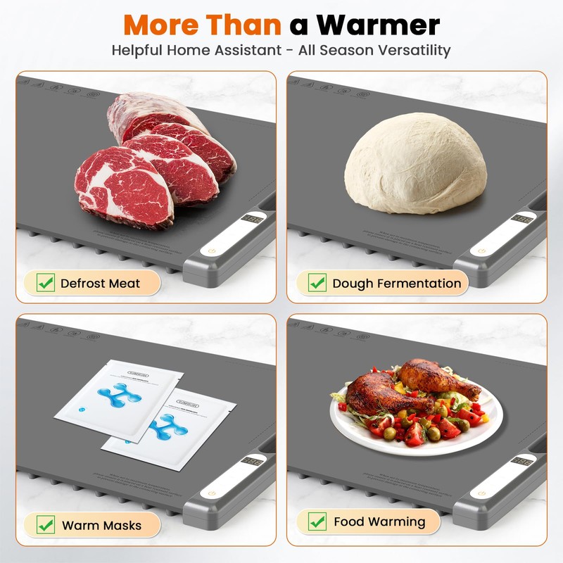 - [Versatile Use for Every Occasion]--More than just a food warmer, our silicone electric warming tray is a versatile kitchen assistant. Use it for defrosting, dough fermentation, mask warming, and more. Perfect for family dinners, buffets, gatherings, parties, and travel, it's a year-round essential for any home.