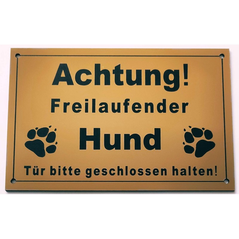 Warning Sign "Achtung Freilaufender Hund, Tür geschlossen halten" Sign, Dog Sign, Gold (15 x 10 cm, 4 Holes Corner)