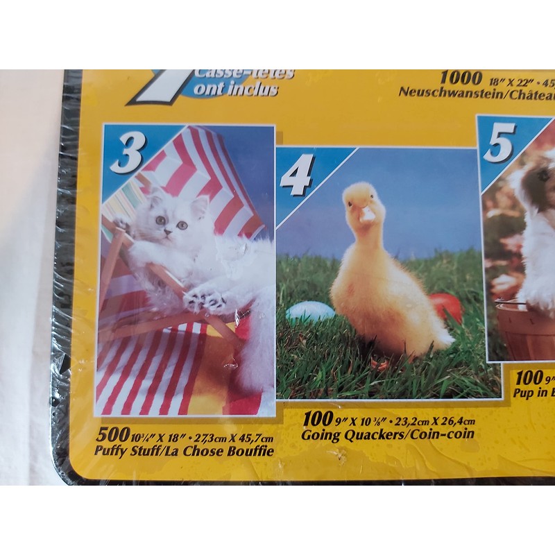 7 puzzles: 1000pc castle,750pc bridge, 500pc white cat in beach chair, 4 100pc: 2 kittens in a basket, duckling, tea set, puppy in a barrel