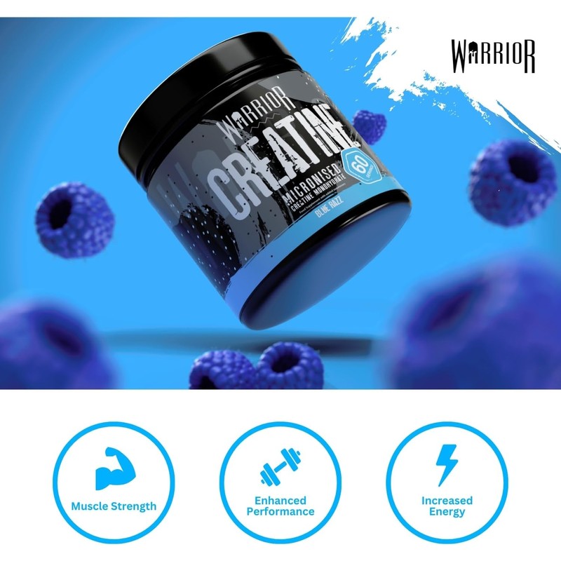 Warrior Creatine Monohydrate Powder – Micronised for Easy Mixing and Consumption – 100 Percent Pure Creatine – Proven to Improve Physical Performance and Recovery, 5 g Servings (Blue Razz, 300 g)
