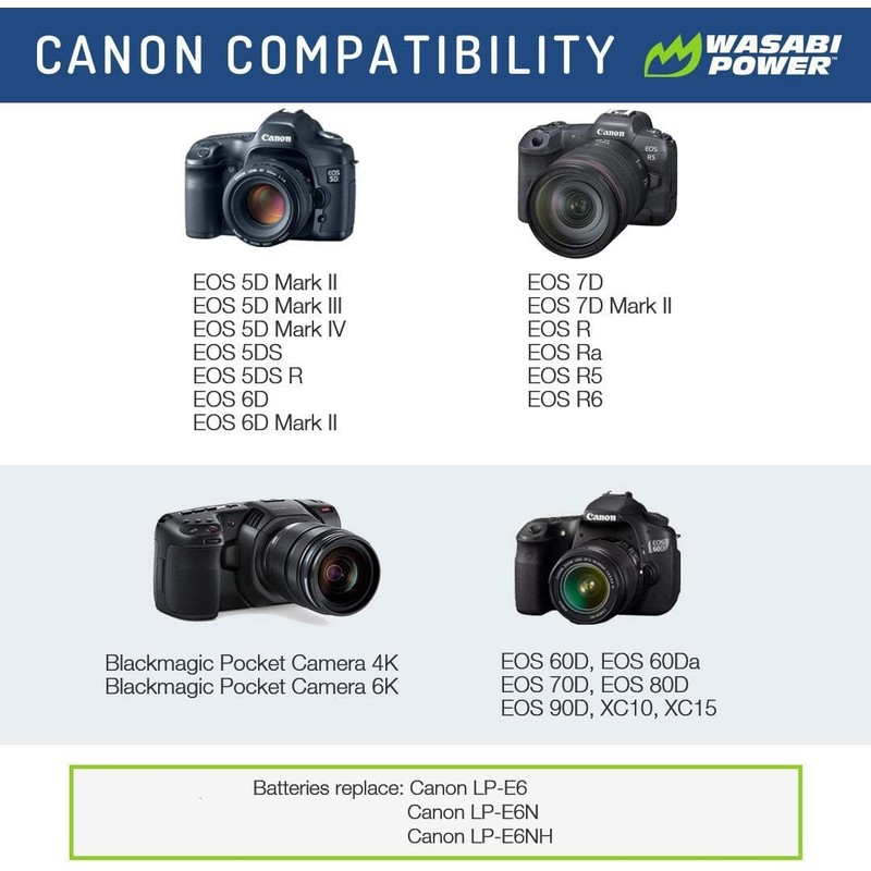 - COMPATIBILITY - This dummy battery replaces the Canon LP-E6 and works for Canon EOS R, R5, R5C, R6, 90D, 80D, 70D, 60D, 60Da, 5D Mark II, III, IV, 6D Mark II, 7D Mark II. (NOTE: Please verify your camera uses a Canon LP-E6 battery and has a battery cover with cable hole)
