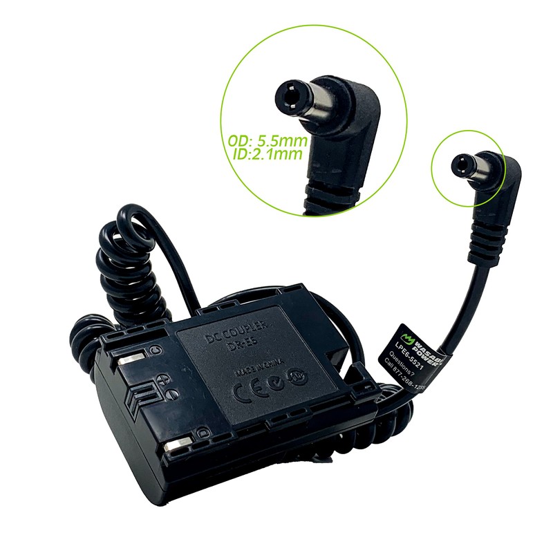 This Wasabi Power DCC-LPE6 Dummy Battery replaces the LP-E6, LP-E6N, or LP-E6NH battery pack. It is a replacement for the Canon DR-E6 coupler.