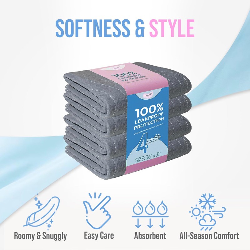 - SCOPE OF DELIVERY: Pack of 4 heavy absorbency underpads, 31 x 36 inches, waterproof, reusable, washable, super soft texture, quickly dries in about 10 minutes.