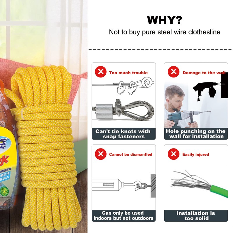 - ✅【Low Elasticity】Heavy duty laundry string can withstand a large degree of tension and has the characteristics of low elasticity, your clothes are not easy to fall on the ground