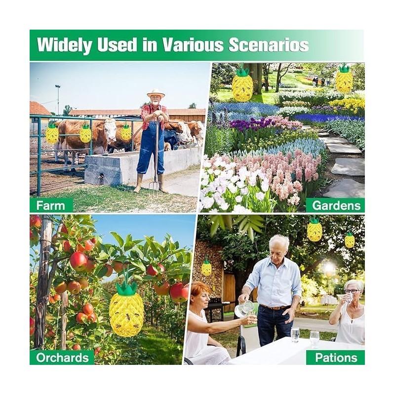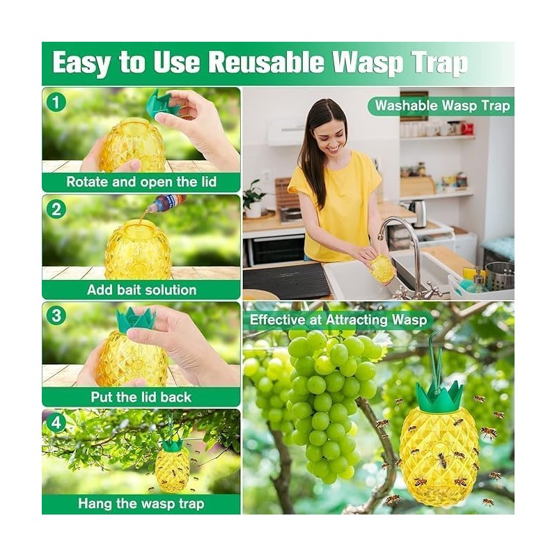 • 【Upgraded Effective Wasp Trap Pineapple Shape】These wasp traps are an effective solution to outdoor wasps, yellow jackets and other common insect problems. Our wasp deterrents are green products. The upgraded wasp traps are made of stronger and more durable material. The hornet traps can hang wherever you want after putting in the attractants. The bee traps for outside hanging are not easy to fall off, which can effectively solve the wasp's problems
