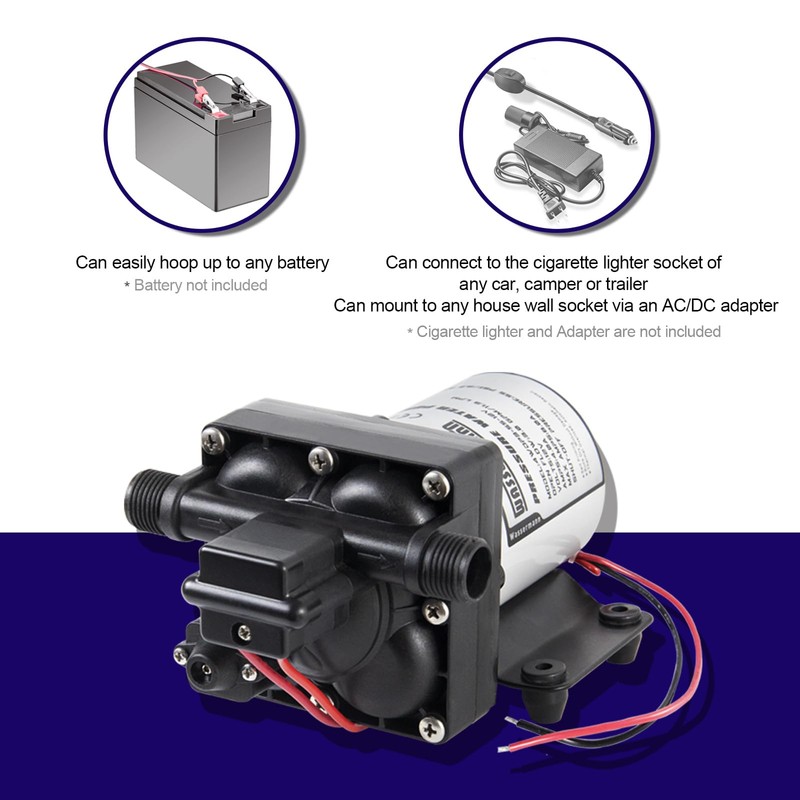 - 【RV Pump Performance】12V DC RV Water pump,3.0GPM water flow.Pressure switch is set to 55PSI.The Electric Water Pump is Designed with a 12V DC Motor,Can be Powered By Any 12 Volt Battery or Mount to Any Cigarette Lighter Socket in the RV and Camper.