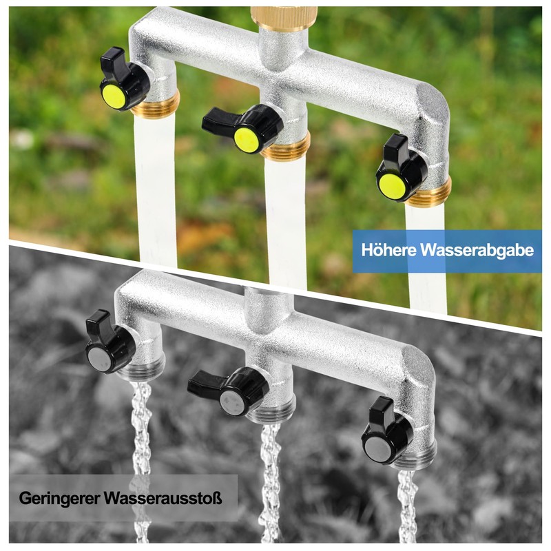 Das Wasserverteiler 3fach verfügt über drei separate Wasserauslässe, die jeweils mit einem schwarzen Regelventil ausgestattet sind.