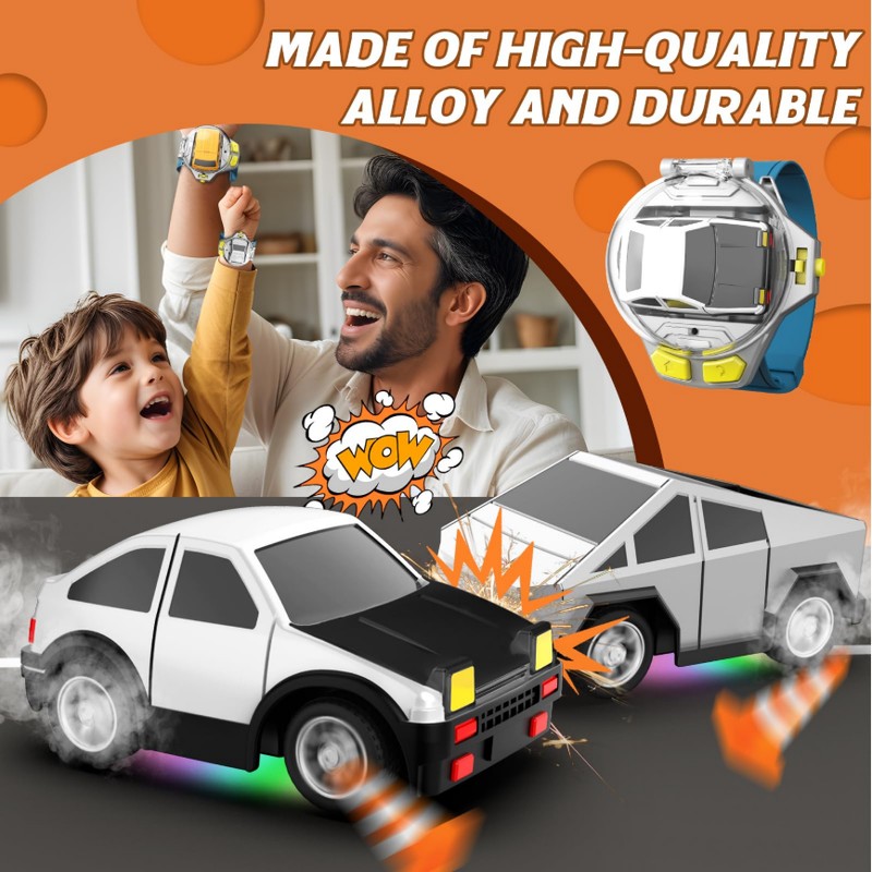 Watch Remote Control Car Toy: Built-in detachable mini rc car in the watch, a novel and innovative watch design. Remote control watch car consolidation the remote control function into the watch, the watch is to control the toy car, children can easily control two buttons to control the rc car to move back and forth or turn. Watch car has a compact body, excellent starting ability and excessive agility. Small rc car is equipped with charming lights, adding infinite fun and fantasy color to child