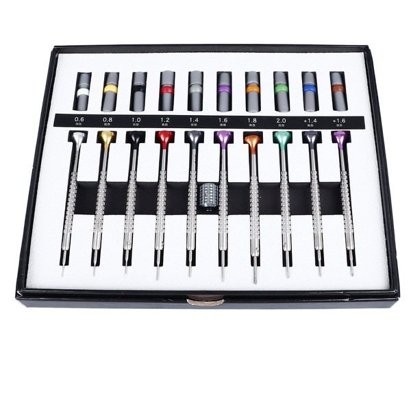 1、Package Includes: Includes 10 screwdrivers/0.6mm, 0.8mm, 1.0mm, 1.2mm, 1.4mm, 1.6mm, 1.8mm, 2.0mm, and 2 crossing head screwdrivers of different sizes, namely, 1.4 mm, 1.6 mm. 2、Wide Application: The set includes various sizes of screwdriver heads, which is color coded, making it suitable for repairing different types of watches. 3、Excellent Metal: Micro precision watch screwdriver is made of quality metal, stable and not easy to break, safe and reliable, not easy to wear, rust resistant 4、Replaceable Screwdriver Heads: Precision screwdriver set comes with replaceable screwdriver heads, providing versatility and ensuring continued use over time. 5、Compact and Portable: This watch repair set is compact and lightweight, making it easy to carry and store, perfect for both professionals and DIY enthusiasts.