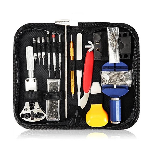 Package Included: 1 x Metal Hammer 3 x Pin Punches(0.8mm, 0.9mm. 1.0mm) 3 x Precision Anti-magnectic Screwdrives(1.2mm, 1.4mm, 1.6mm) 1 x Spring Bar Tool 1 x Adjustable Case Opener 18 x Adjustable Case Opener Pins 1 x Stainless Steel Tweezer 1 x Watch Case Holer(10-45mm) 2 x Spring Bar Tool Spare Tips 2 x Link Remover Spare Pins(Golden) 3 x Link Remover Spare Pins 1 x Watchband Link Pin Remover 108 x Watch Strap Spring Pins (universal Standard pins ) 1 x Watch Case Opener Knife 1 x Watch Back Pry Opener(with yellow ergo handle) 1 x Storage Case