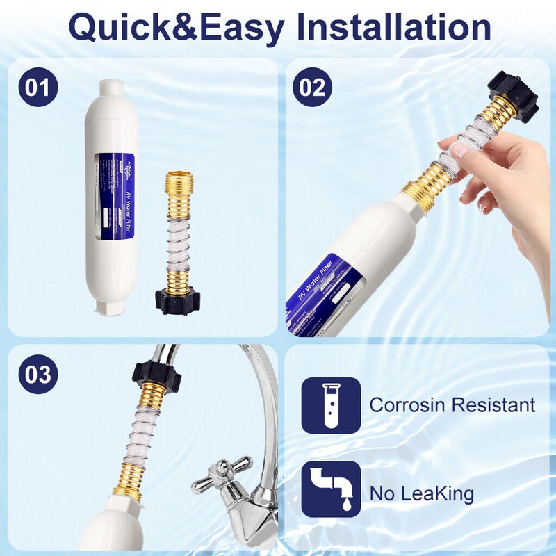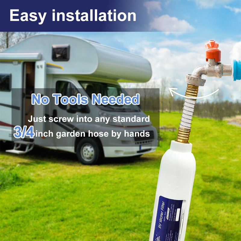 · High Efficiency Filtration: RV water filter reduces many harmful substances from your water including Chlorine, Bad Taste, Odor, Color, VOC, THMS, Rust, Sediments, Turbidity, Corrosion and other dangerous impurities and contaminants, significantly improving the taste of drinking water to provide pure-tasting water, while retaining minerals beneficial to the human body.