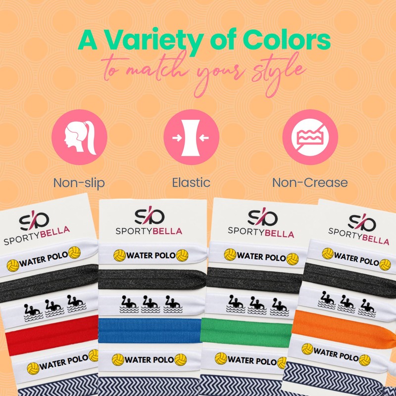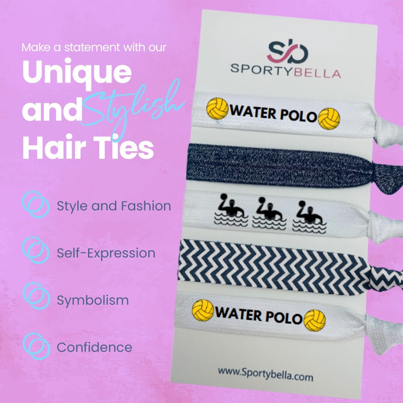- PACKAGE CONTENTS: Set of 6 hair ties – 2 WATER POLO text bands, 1 icon band, 1 black glitter band, 1 yellow solid band, and 1 black-white chevron pattern tie