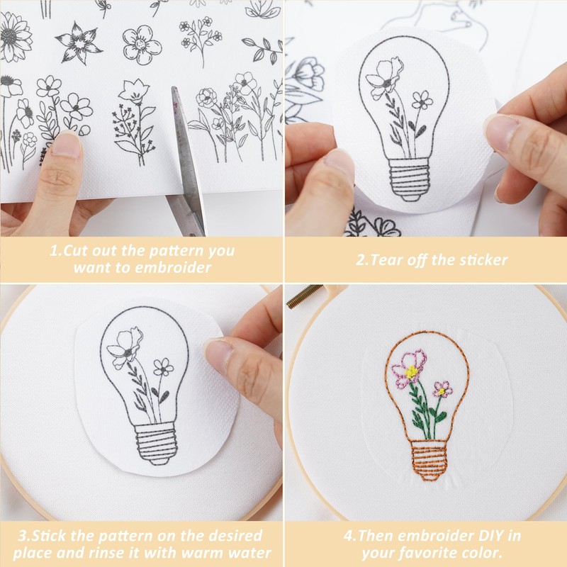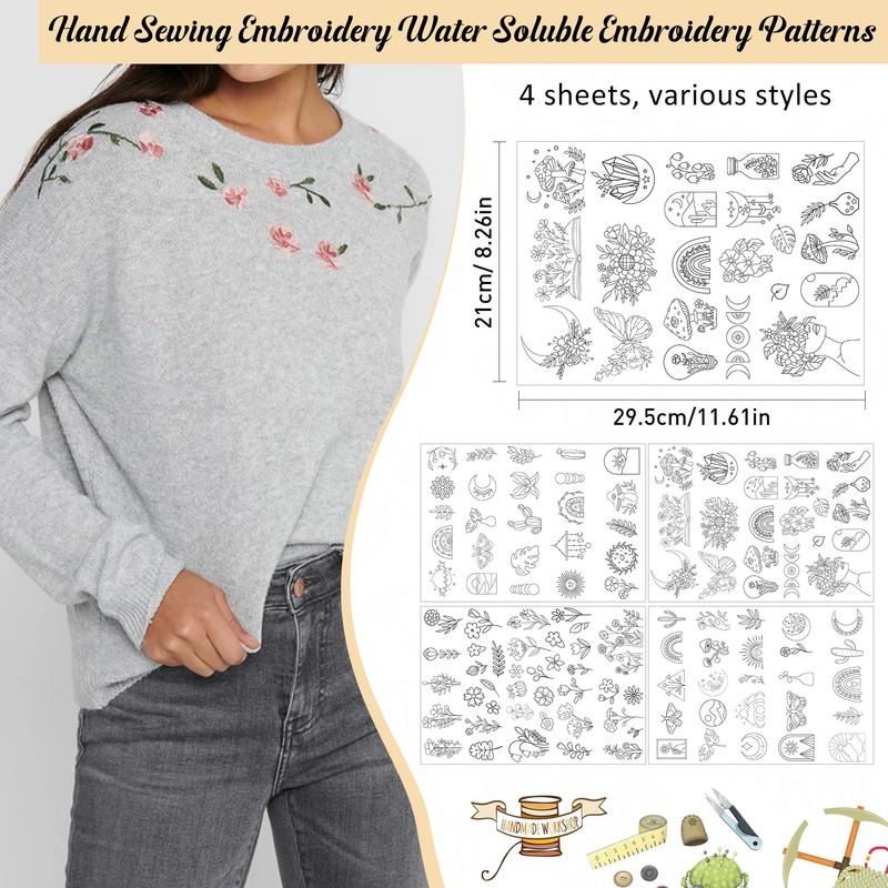 - Stick and Stitch Washy Away Paper: Embark on your DIY journey with a delightful assortment of 110 pcs stick and stitch embroidery patterns. This diverse collection caters to your creative needs, offering a variety of motifs to inspire your embroidery projects.