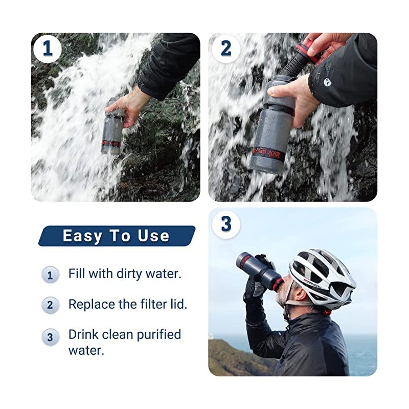 - PURIFIES WATER: water filter bottle transforms dirty water to pure water in seconds. Ideal for cyclists. mountain bikers and athletes