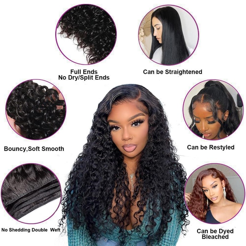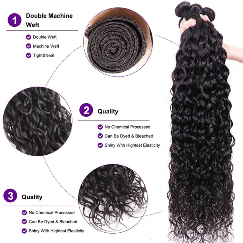 - Hair Quality: 10A Water Wave Human Hair Bundles with Closure, Wet and Wavy Bundles and Closure; Double Machine Weft, Hand Tied, Full and Smooth with Healthy Hair Ends, Tangle Free, Shedding Free, No Smell, Unprocessed Natural Color