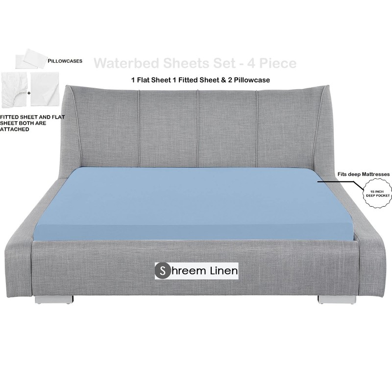 Waterbed Sheets Super Single Size Attached Waterbed Sheets 100% Egyptian Cotton 4 Piece Sheet Set 15" Deep Pocket Attached Waterbed Sheet Set in Solid (Light Blue, Super Single)