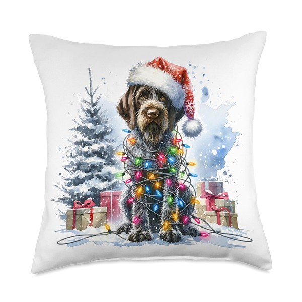 Watercolor German Wirehaired Pointer Dog Christmas Lights Throw Pillow