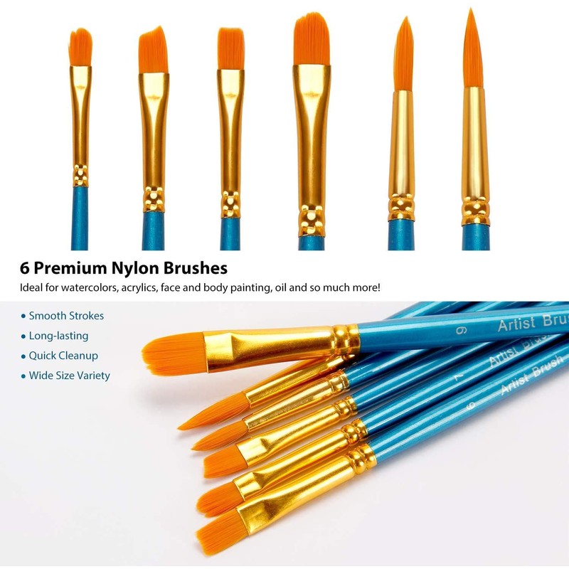 - 6 PROFESSIONAL NYLON HAIR PAINTING BRUSHES INCLUDED: Quality brushes make all the difference. Each of the 6 nylon brushes provide, fluid, even strokes and effortless blending. Use them with acrylic paint, watercolours, oil paint, face and body paint, and more.