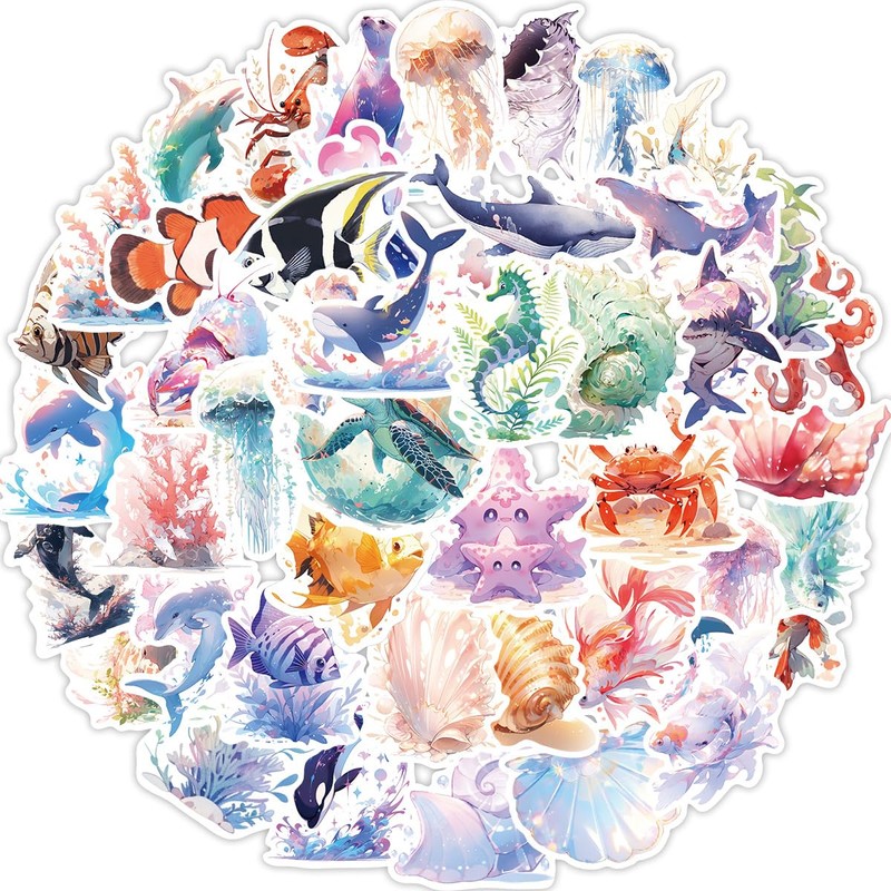 Watercolour Sea Creatures Stickers for Laptop (50 Pieces), Gift for Children, Teenagers, Adults, Boys, Sea Creatures Stickers, Waterproof Vinyl Stickers for Scrapbooking, Skateboard, Car, Luggage