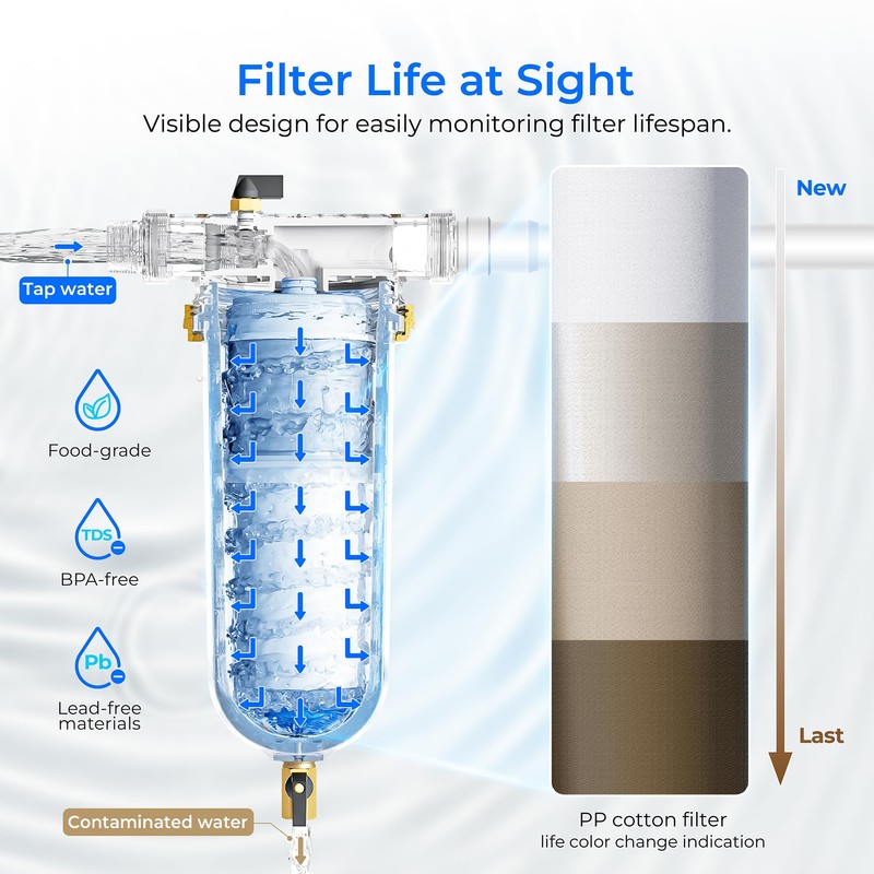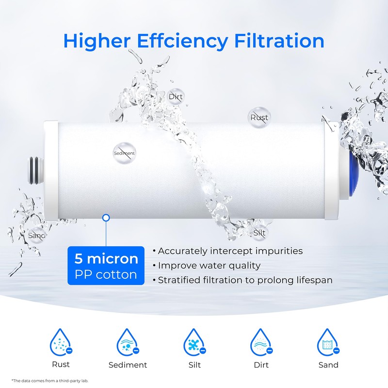 - NSF/ANSI Certified: This filter use BPA-free and food-grade materials, through the NSF/ANSI 372 lead-free material certification, to provide you with peace of mind water security. And effectively reduce sediment, rust, dirt, sand, silt,and more to protect your water health.