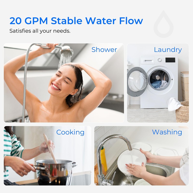 - Stable Water Flow: It provides you with 20GPM stable water flow and suitable for a variety of water sources, including municipal water and well water. Meets your daily needs, such as cooking, bathing, washing and more.