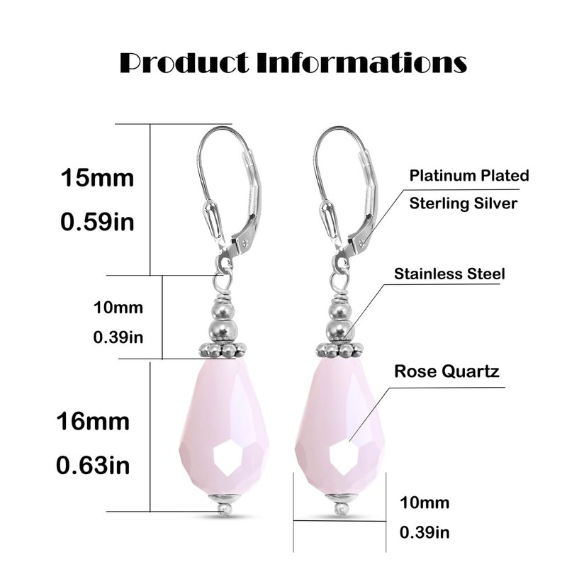 - 💎MATERIAL&SIZE💎Genuine rose quartz stone,waterdrop shape.all natural,slightly different on colors.The Earrings hooks are made of sterling silver,Platinum plated.The other metal parts are made of 316L stainless steel. No Fadding,No Rusting,Strong Wear Resistance,Scratch Resistant,Sweatproof,Harmless to the skin.The stone size is 14mm*10mm/0.55in*0.39in ,The earrings hooks size is about 15mm/0.59in.and the whole earrings is 40mm/1.57in.