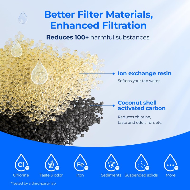 - [Premium Filter Material] Adopts a pre-filter layer with coconut shell activated carbon and high-quality ion-exchange resin to ensure maximum filtration and cleaner water possible.