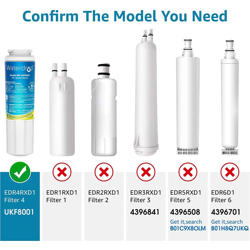 - Compatible models: EveryDrop Filter 4, EDR4RXD1, EDR4XD1B, EDR4RXD2, Whirlpool 4396395, UKF8001AXX-750, UKF8001AXX-200, AMANA UKF8001P, UKF8001AXX, UKF9001, Sears or Kenmore 9006, 9992, 9005, 9084, Bosch BORPLFTR20, PUR, Viking RWFFR, 67006475, WF295, Puriclean II. Waterdrop is an independent brand.