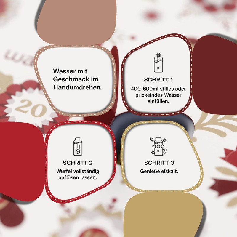 Spoiler alert! These surprises await you: 1 advent calendar (24.3 cm x 24.4 cm x 2 cm) includes: 17 x micro drinks (including limited edition), 2 x microenergy, 6 x microlyte