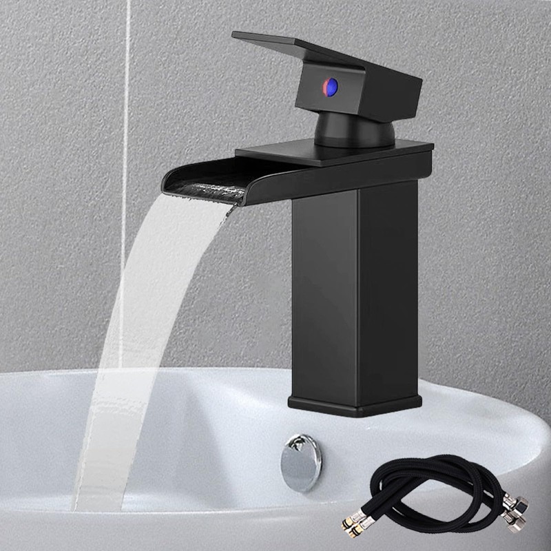 Waterfall Tap Bathroom Black, Sink Tap, Stainless Steel Washbasin Tap, Hot and Cold Water Tap, Modern Single Lever Mixer Tap Sink for Bathroom (60 cm Pipes Included)
