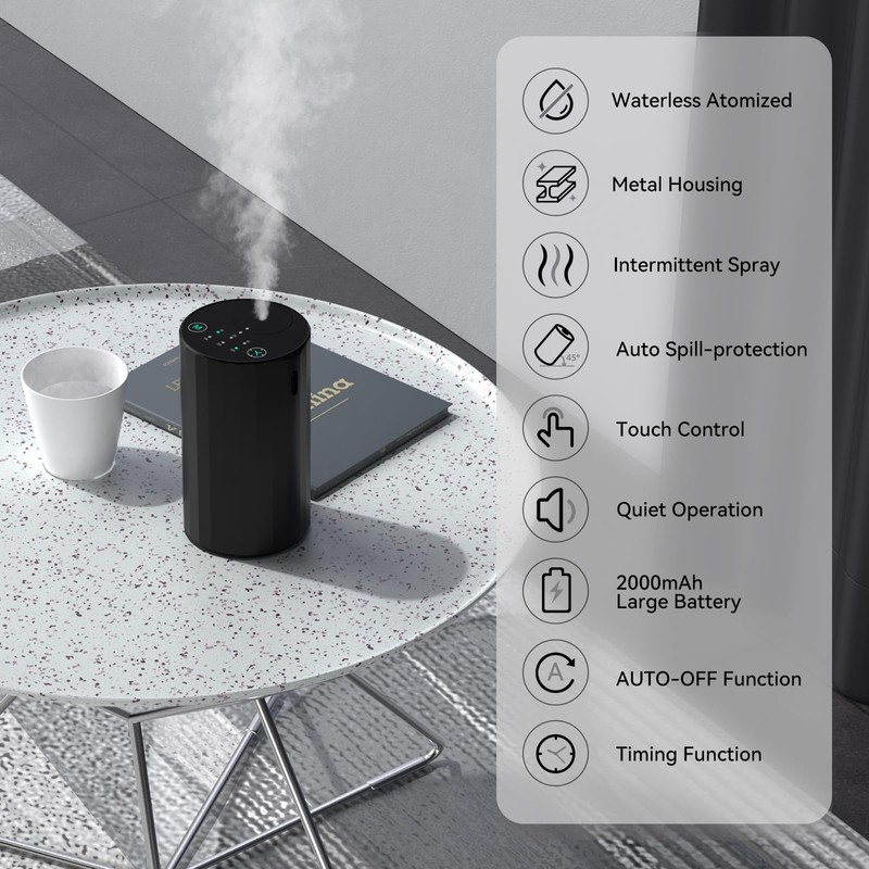 Waterless Essential Oil Diffuser Aromatherapy Scent Diffusers for Home Large Room, Bedroom, Car, Office, Desk, Battery Operated Mini Portable Air Freshener (Black)
