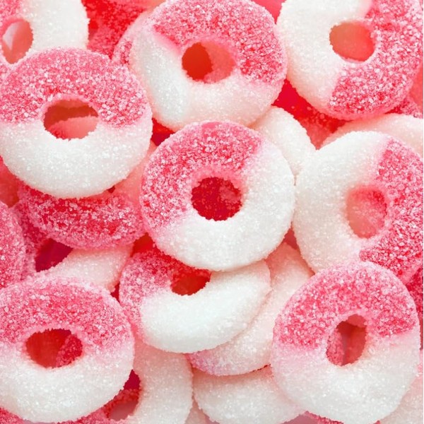- Delectable Gummy Rings: Indulge in the irresistible taste of these chewy, fruity gummy rings in vibrant pink and white hues.