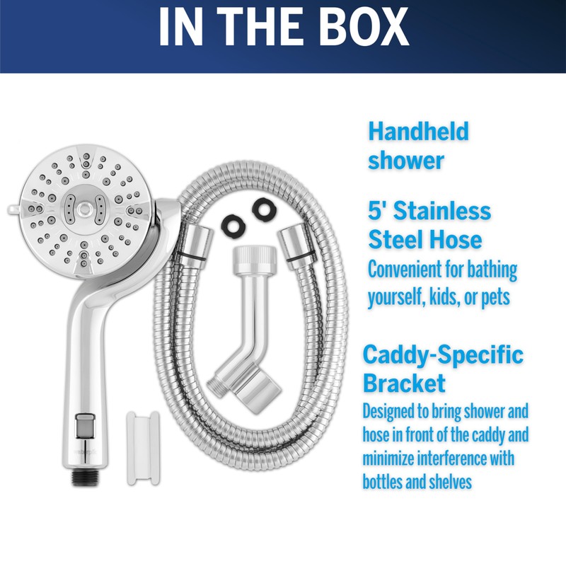 - SHOWER CADDY COMPATIBLE: Waterpik Caddy Buddy shower head features a smartly designed bracket that brings the shower head and hose in front of the caddy, so it doesn’t interfere with caddy storage; no more knocking over bottles or fighting the shower hose