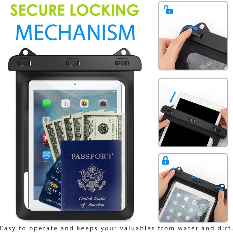 - Full touchscreen functionality. Universal size waterproof case bag fits all tablets up to 11" diagonal size. IPX8 Certified waterproof. Floats safely if dropped in the water.