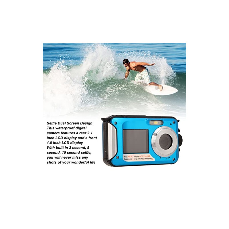 - Selfie Dual Screen Design: This waterproof digital camera features a rear 2.7 inch LCD display and a front 1.8 inch LCD display, with built in 2 second, 5 second, 10 second selfie, you will never miss any shots of your wonderful life.