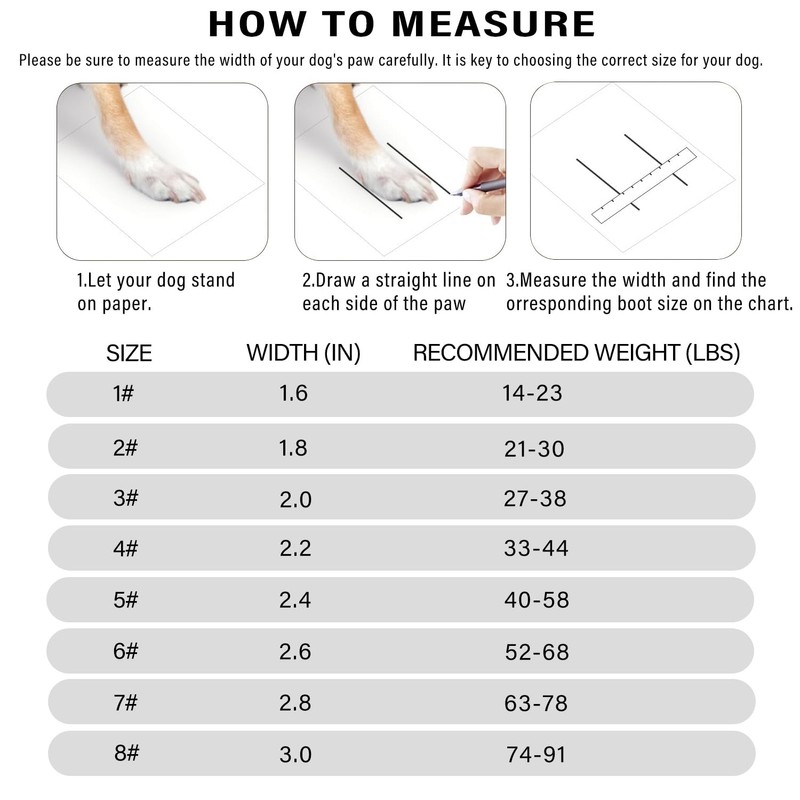 - Simple Sizing, Perfect Fit: We provide an easy sizing guide to ensure your pet wears comfortably! Simply trace your pet's paw and refer to our size chart to choose the right size, allowing your pet to fully enjoy the fun of their new boots.