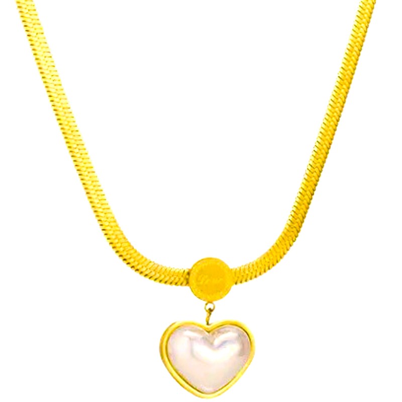 - Design Notes: Made with Titanium and plated with 18K Yellow Gold in a smooth shiny snake chain. Featuring a pearly heart with the word "love" engraved.