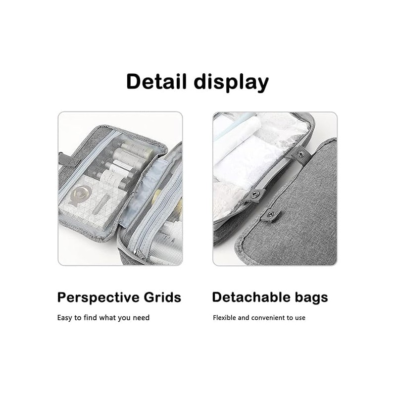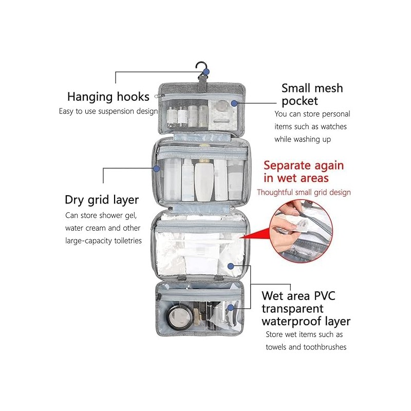 - [Hanging Waterproof Travel Bag] Even if you put a lot of things, you can quickly find what you want. The two PVC compartments below prevent moisture from entering the other compartments. The lower bag can be easily removed and used flexibly. There is a hook inside. You can hang it anywhere you want.