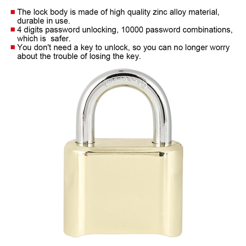 1、The lock body is made of high quality zinc alloy material, durable in use. 2、Waterproof rating IP65, even in rainy day, you can easily unlock as usual. 3、4 digits password unlocking, 10000 password combinations, which is safer. 4、You don't need a key to unlock, so you can no longer worry about the trouble of losing the key. 5、Professional manufacturing, stable performance, reliable quality.