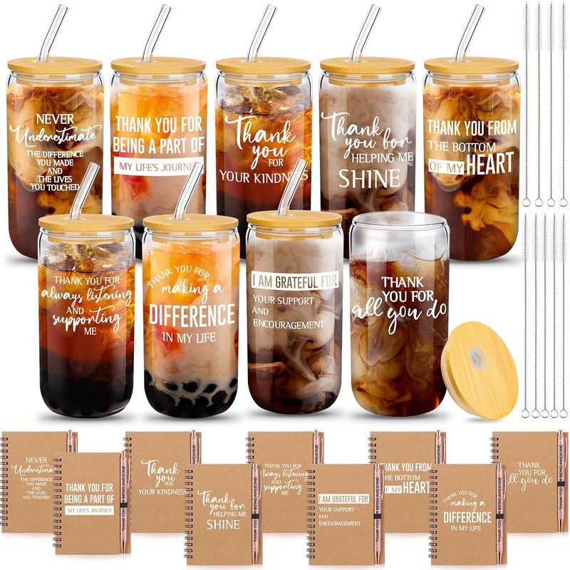 - Employee Appreciation Gifts: you will receive 27 pcs employee appreciation gifts bulk, including 9 pcs thank you glass cups with straws and brushes, 9 pcs A6 leather journal notebook and 9 pcs glitter ballpoint pens, providing enough quantity to meet your various gifting needs