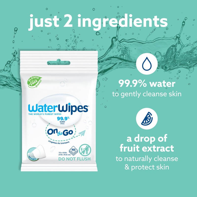Families can trust WaterWipes On the Go Wipes to gently clean & help protect sensitive skin while on the go. Our new On the Go Wipes have just 2 ingredients: 99.9% ultra-purified water and a drop of fruit extract.