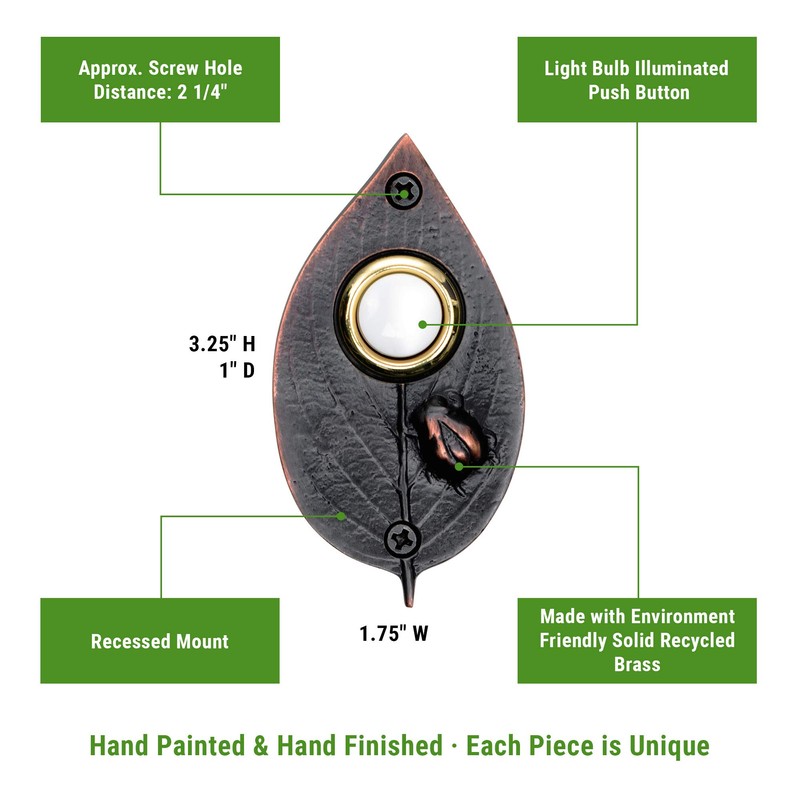 Waterwood Solid Brass Ladybug on Leaf Doorbell in Oil Rubbed Bronze - Wired & Illuminated Push Button from Environmentally Friendly Recycled Material