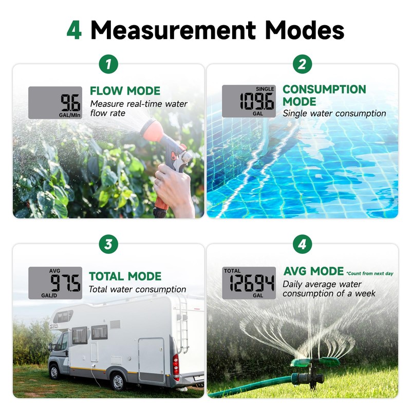 - Easy One-Touch Control: Short press to switch modes; long press to toggle units (gallons ↔ liters) or reset data. Screen sleeps after 1 minute of no activity.