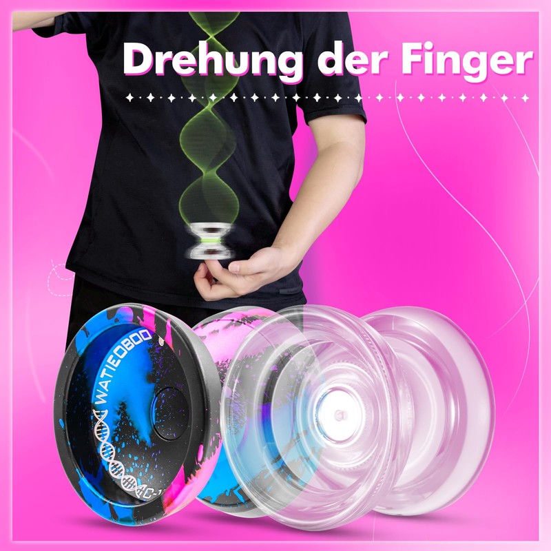 - With the WATIEOBOOYOYO Yo-Yo set, you will receive 1 metal yo-yo in camouflage + 1 crystal clear PC crystal yo-yo that can switch between "react" and "do not react" modes. This yo-yo set can be used by anyone from beginner child to adult professional and advanced yo-yo enthusiast. It's also the ultimate yo-yo gift for kids or friends and an essential yo-yo set for all yo-yo enthusiasts