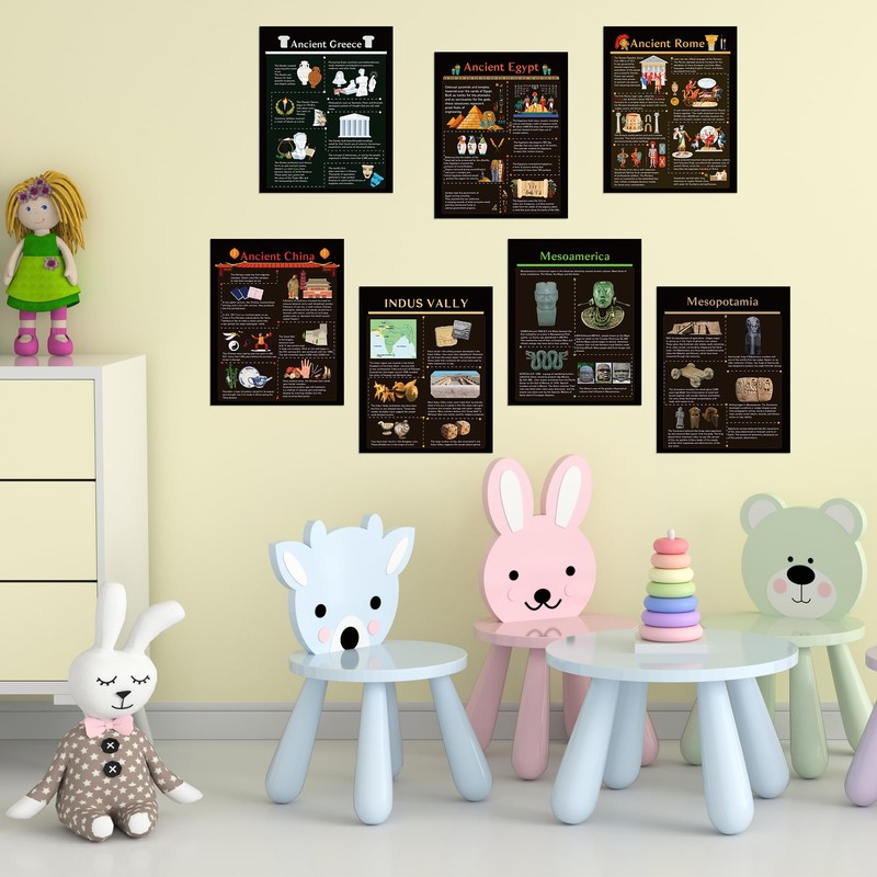 • Exquisite Design -Our learning material posters are printed with ancient artifacts and presentations from 7 countries, including Ancient Egypt, Mesopotamia, Ancient Rome, Ancient Greece, Ancient China, Mesoamerica, Ancient India. They can be great teaching materials for teachers to help students learn and remember more information.
