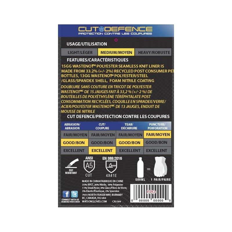 - 18gg HPPE / WasteNot polyester seamless knit made from 12% (+/-2%) recycled post consumer PET bottles provides ANSI A2 cut protection.