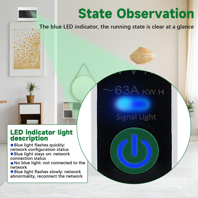 3. Dieser WLAN-Wechselstromzähler Hutschiene ist mit einer blauen LED-Anzeige ausgestattet, die den Betriebszustand auf einen Blick anzeigt. Die intelligente Schutzfunktion bietet Über- und Unterspannungsschutz, Überlastschutz, Überlastschutz, Hochtemperaturschutz, Überstromschutz usw. für eine sichere Anwendung.